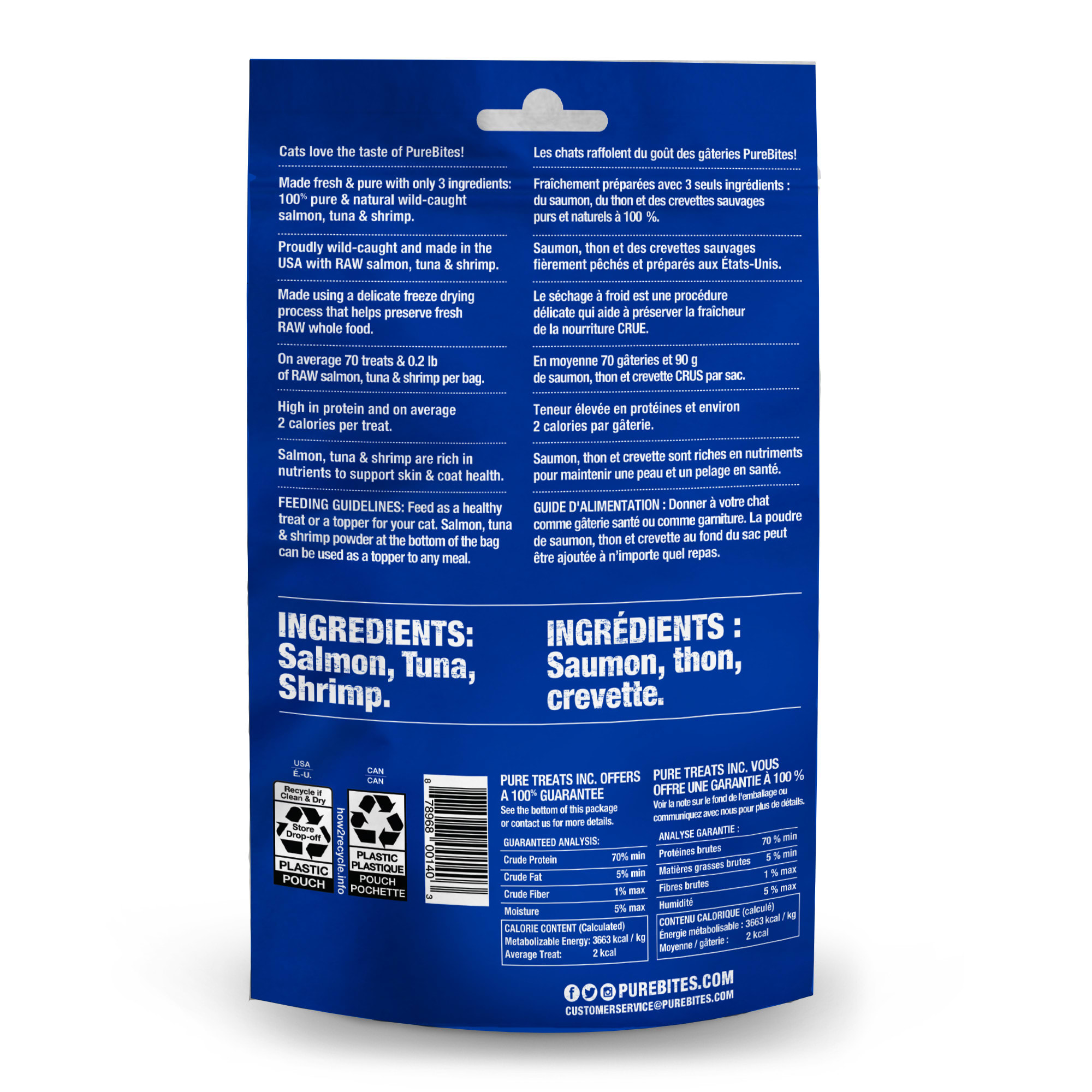 - Made with only 1 ingredient. 1-888-388-PURE 7873 By Email. Up to 4 cash back PureBites Salmon 049oz 14g has 80oz of RAW Salmon per bag and up to 185 treats per bag.